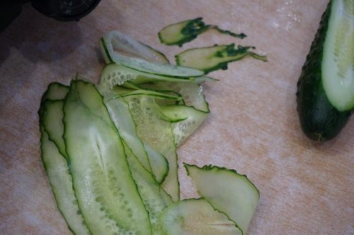 Порезать тонкими пластинами огурец свежий, можно воспользоваться теркой,