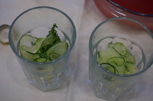 И сложить, свернутые огуречные пластины, неплотно в стакан, оставив место для льда и маслин. Кладем кусочки льда по 3-4 штуки в каждый стакан,