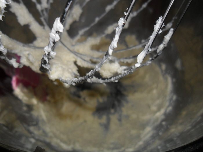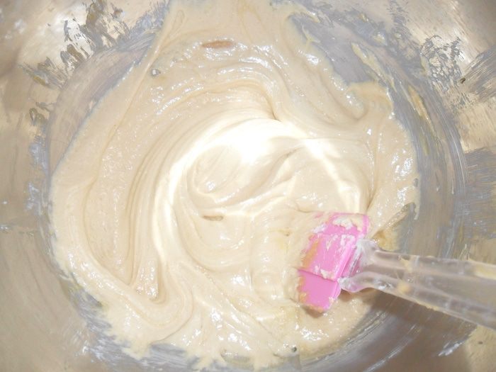 Не прекращая взбивать, положить 2 ч.л. муки, ввести яйца. Всыпать оставшуюся муку, хорошо перемешать.