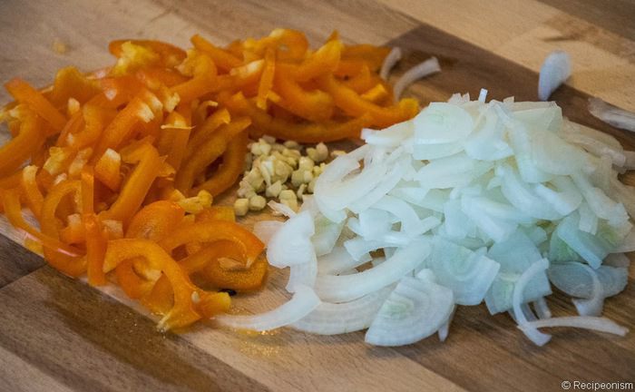 Итак, макароны варятся, а мы нарезаем лук чертвертькольцами, перец полосками (они же полукольца), мелко рубим чеснок.