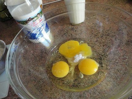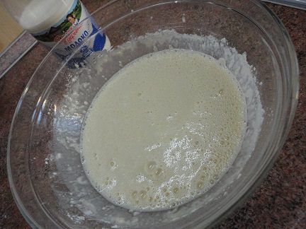 Влить молоко «Домик в деревне» и растительное масло. Просеять муку с содой и замесить тесто. Если оно окажется густым, можно довести его до нужной консистенции кипяченой водой.