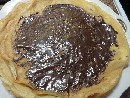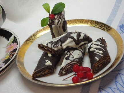 Блинчики вы можете приготовить по своему любимому рецепту, а добавив шоколад, вы превратите их в пирожные-рулетики.