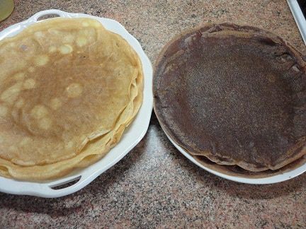 Испечь 6 белых блинов. Затем в оставшееся тесто добавить порошок какао и испечь еще 6 темных блинов.
