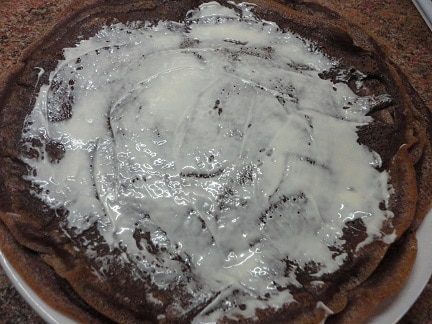 Шоколад растопить на водяной бане. Белым смазать темные блины,