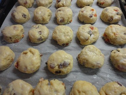 Масло растереть с сахаром. Добавить смесь сухих ингредиентов и изюм. Перемешать и, подливая молоко, замесить тесто. Долго не вымешивать, чтобы оно не затянулось. Да оно того и не требовало. Получилось очень мягко, к рукам не липло, приятное на ощупь.