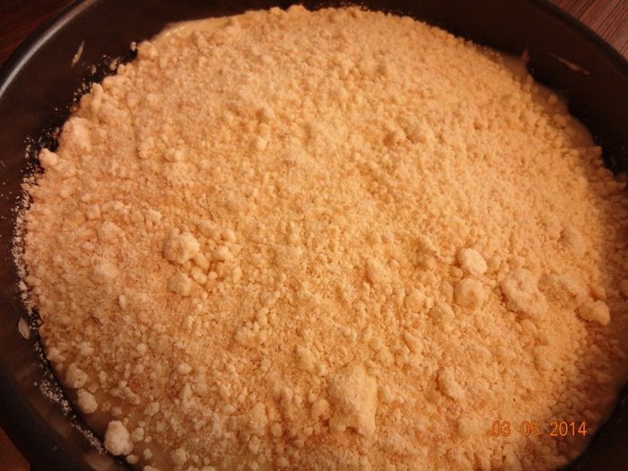 Затем выложить оставшееся тесто, на него остатки крошки, равномерно распределив их по поверхности. Отправить пирог в духовку на 50-60 минут. Если бортики вашей формы низкие, автор рекомендует поставить вниз пустой противень, т.к. пирог будет хорошо увеличиваться в процессе выпечки и верхний слой крошки может пересыпаться за край формы.