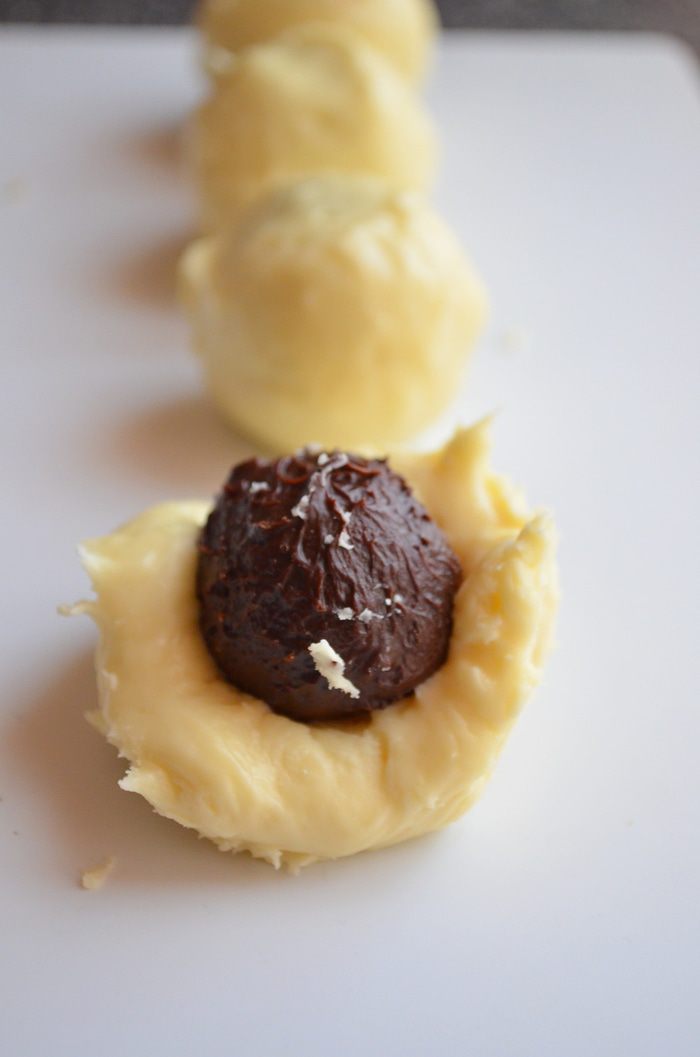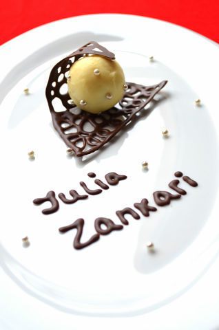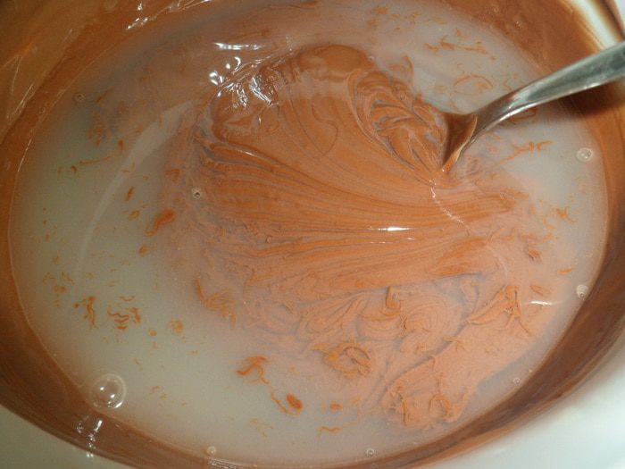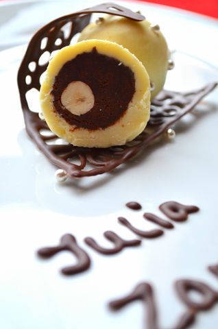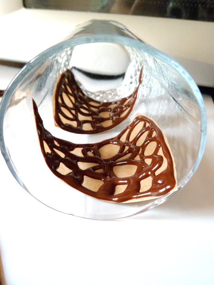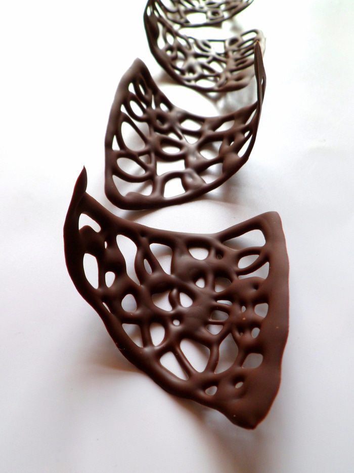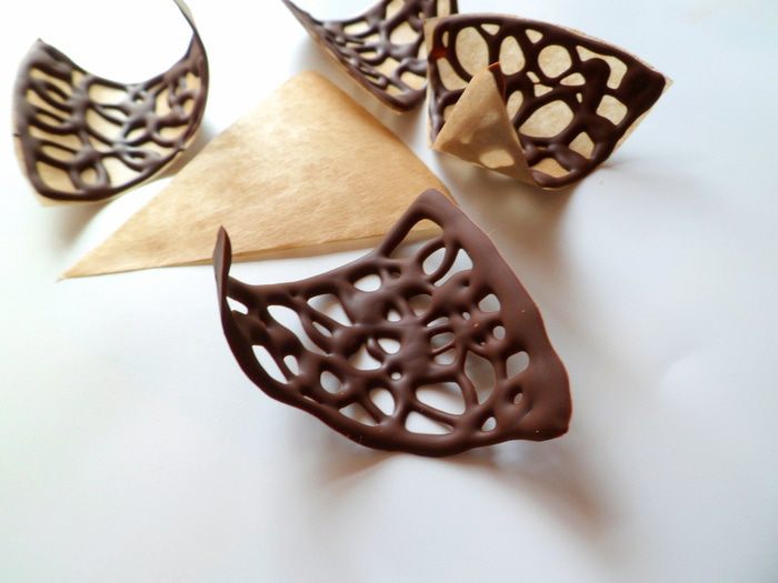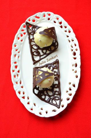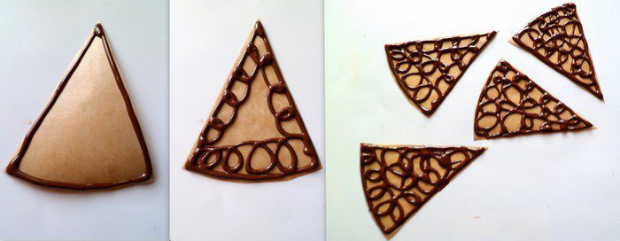 Для ажурной обертки топим шоколад, оставляем остывать на некоторое время. Когда шоколад будет по консистенции как густая сметана, помещаем его в полиэтиленовый мешочек (или в кондитерский шприц). Из бумаги вырезаем треугольники (можно какие угодно фигуры). Рисуем сначала основу, шоколад не должен быть жидким иначе фигуры будут хрупкими. Зарисовываем серединку, произвольно. Оставляем немного заготовки ,когда шоколад начнет немного застывать.