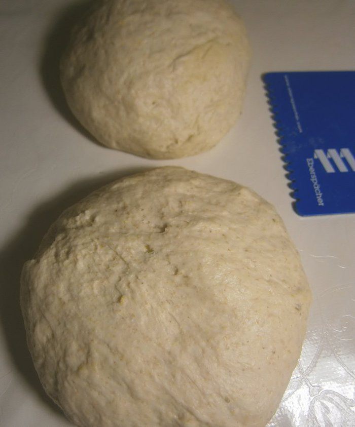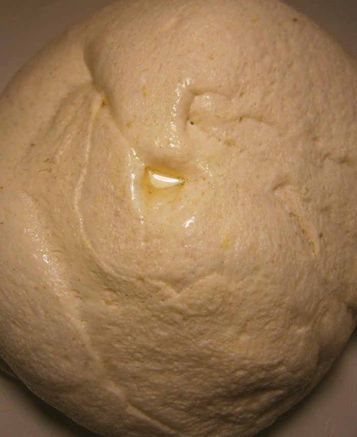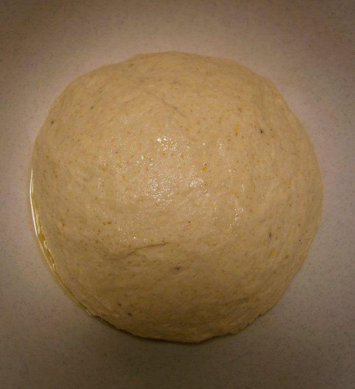 Уложить тесто в смазанную кукурузным маслом глубокую миску, накрыть плёнкой и поставить на 3 часа для подхода. С одной обминкой в середине (через 1,5 часа) подхода.