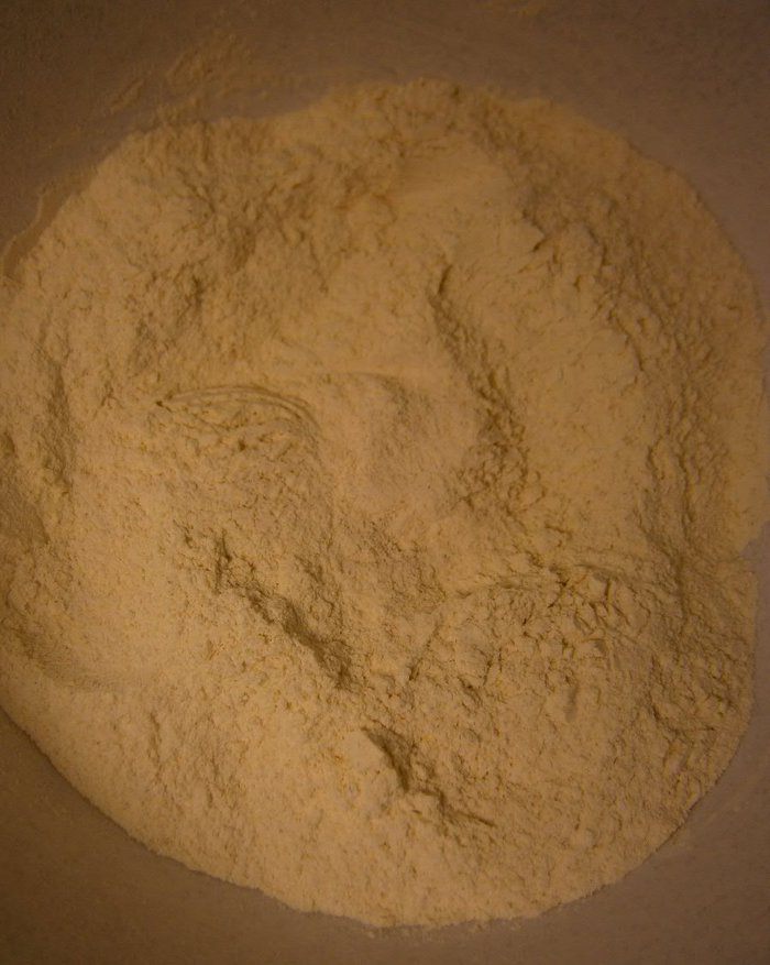 В миске смешать всю просеянную муку, дрожжи и премешать.