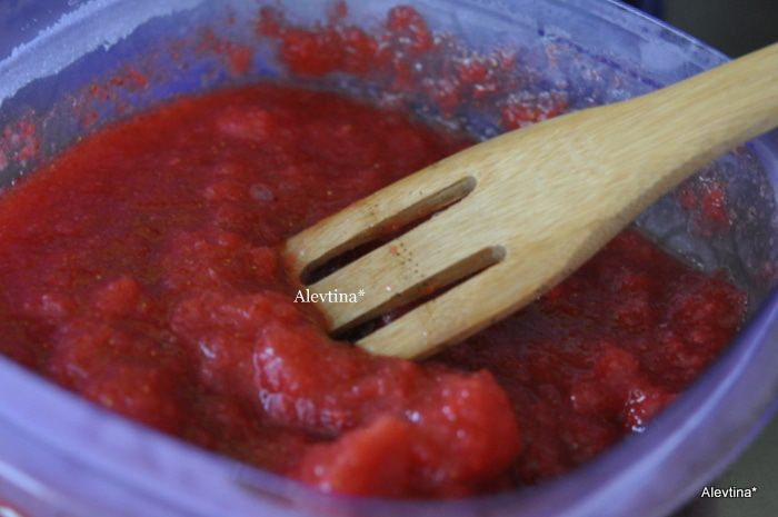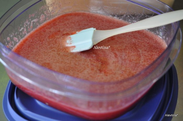 Вылить клубнику в контейнер квадратный или прямоугольной формы. Перемешать,закрыть крышкой и поставить в морозильник на 2 часа.