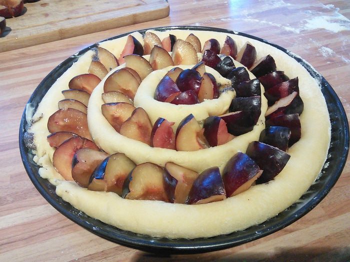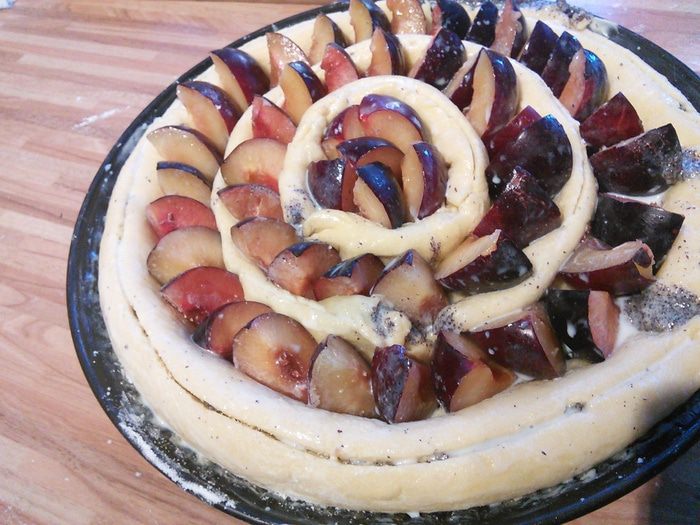Для теста смешать просеянную муку с дрожжами. У меня сухих не оказалось, поэтому взяла 41г свежих, развела теплым молоком, добавила ложку сахара и поставила на 10-15 мин в тёплое место. Если работаете с сухими дрожжами, то вмешайте их прямо в муку, добавьте желтки(комнатной температуры), размягченное масло, соль, сахар и молоко и вымесите гладкое тесто.