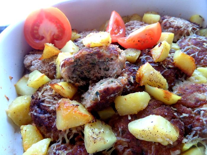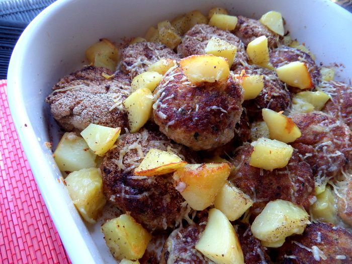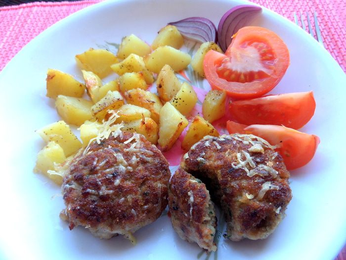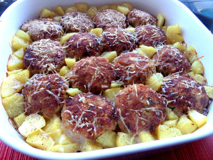 Между котлетами удобно поместить отварную картошку,нарезанную на ломтики.