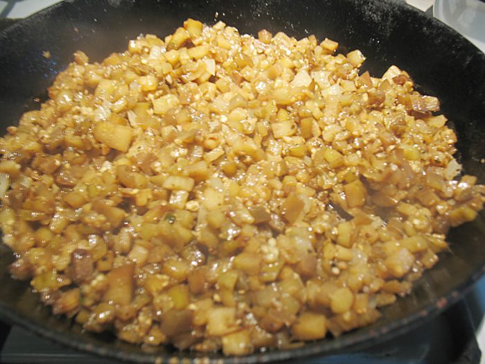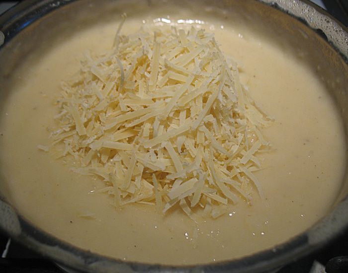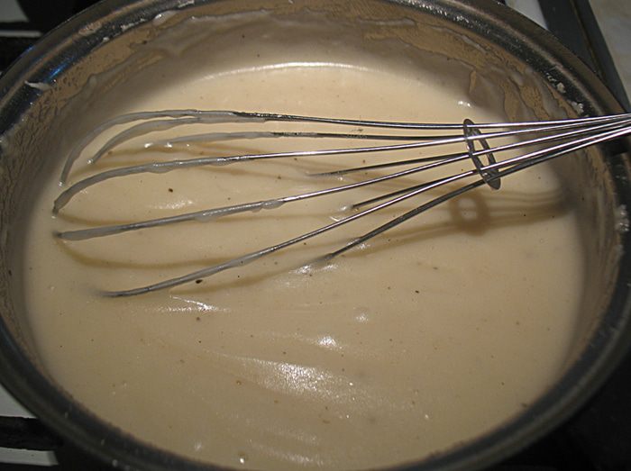 Готовим заправку. В сотейнике прогреть оливковое масло, когда масло прогреется всыпать муку, хорошо перемешать и прожарить муку пару минут. Добавить холодный овощной бульон, довести до кипения постоянно мешая венчиком. На слабом огне варим около 10 минут, периодически помешивая. Солим, перчим по вкусу.