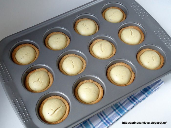 Распределить тесто по формам для корзинок (этого количества теста хватит на 24 корзинки). Наколоть тесто вилкой. Выпекать в заранее разогретой духовке при 180°С на 10 минут на среднем уровне. После, вынуть корзинки из духовки, заполнить их начинкой почти до краев теста и снова поместить в духовку на 15 минут на нижний уровень.