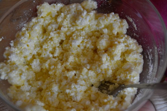 Творог я покупаю зернистый, потому что в этом печенье мне нравится, именно такая его структура. Творог хорошо размешиваю с яйцами.