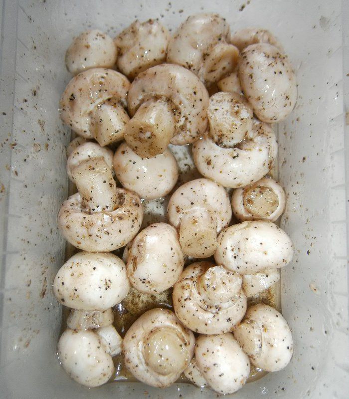 Маленькие шампиньоны промыть. Добавить масло, соль, перец, кориандр. Перемешать и дать постоять 5 минут.