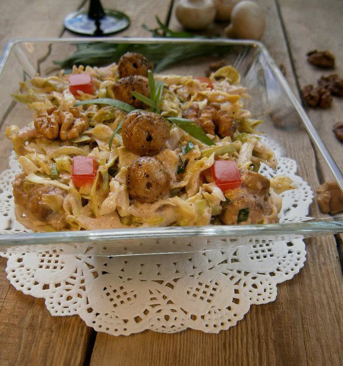 Вся прелесть салата в заправке из грецких орехов, попробуйте, и вы поймёте, о чём я.