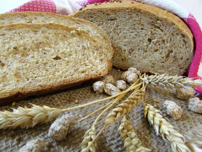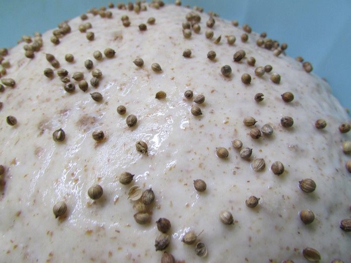 Подошедший хлеб смазать с помощью кондитерской кисточки молоком и присыпать кориандром. Отправить в разогретую духовку (200 градусов). Выпекать 35-40 минут. Готовность проверить деревянной лучинкой.
