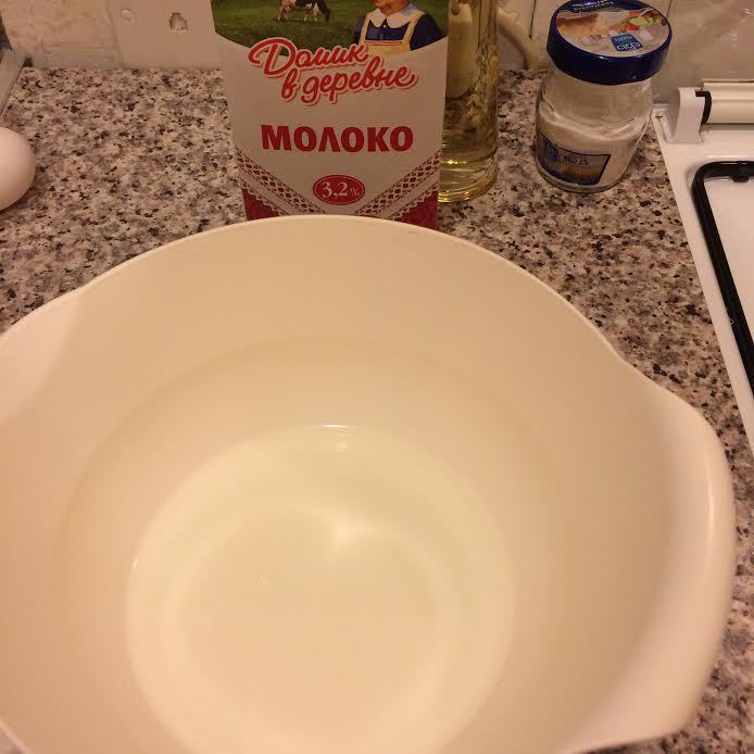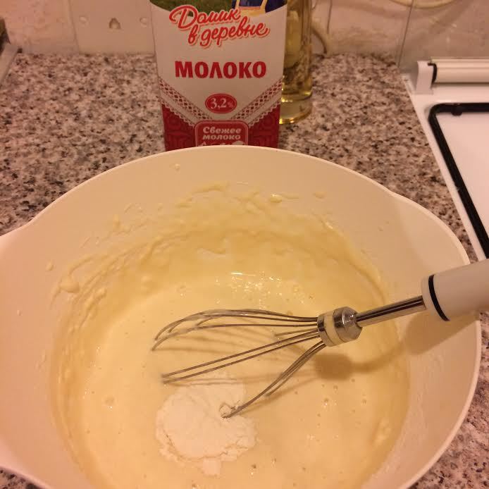Молоко «Домик в деревне» довести до кипения и влить тонкой струйкой в тесто, непрерывно взбивая венчиком. Затем добавить растительное масло и еще раз хорошо взбить.