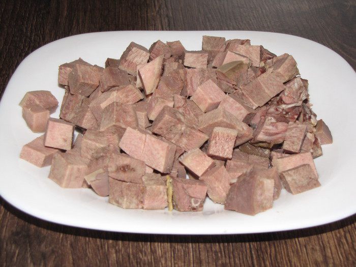 Остывший язык нарезать кубиками, примерно 1х1 см.