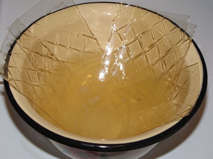 Вино, бульон и желатин смешать. У меня было 5 пластин желатина, всего 12 г. Нагреть смесь до полного растворения желатина. Это заливка для террина.