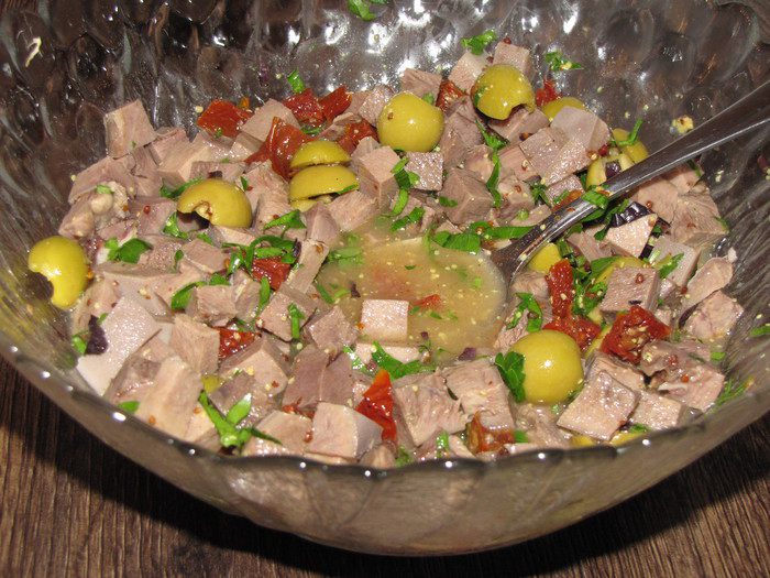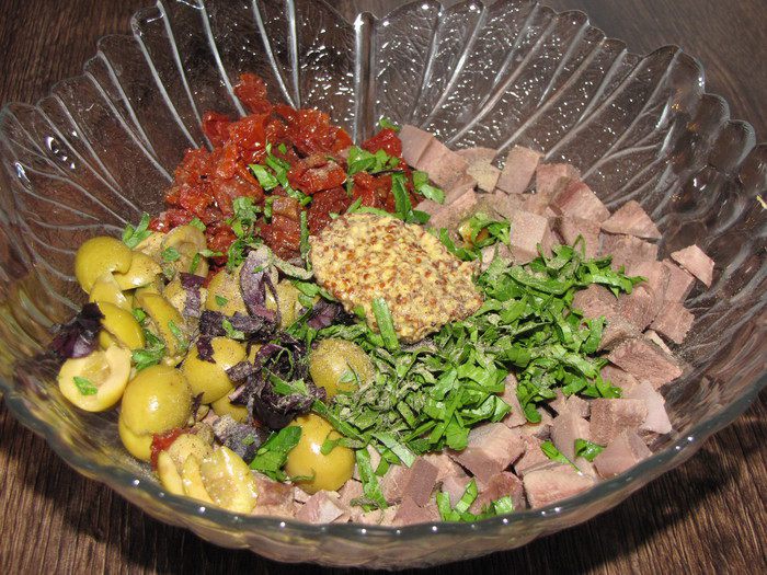 В отдельной миске смешать кубики языка, томаты, оливки, каперсы, петрушку, базилик и горчицу. Я каперсы не добавляла. Поперчить, солить не нужно, и хорошо перемешать.