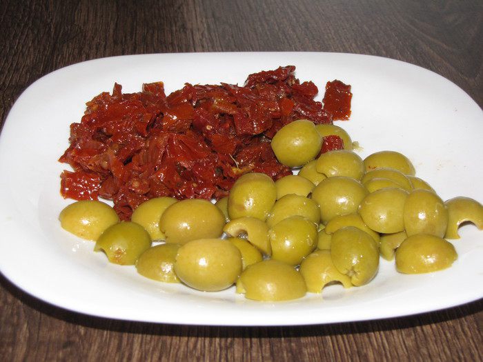 Пока язык остывает, нарезать вяленые томаты, предварительно слив масло. Оливки разрезать пополам.