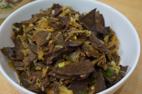 Соединяем лук с ливером, перчим, солим по вкусу. Вот и готово блюдо. Подавать к столу можно как с овощами, макаронами, так и самостоятельным блюдом.