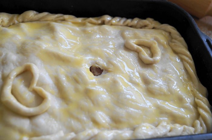 Вторую часть теста раскатать и накрыть ей верх пирога. Защипать края, украсить на свой вкус и сделать в серединке пирога "пупочек". Верх пирога смазать взбитым желтком. Выпекать пирог при 180 градусов (не менее часа) до золотистой корочки.