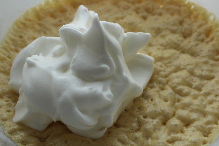 Белки взбить в стойкую пену, добавить в тесто и аккуратно перемешать. Дать подойти третий раз 40-60 минут.
