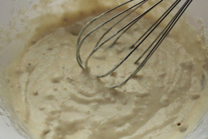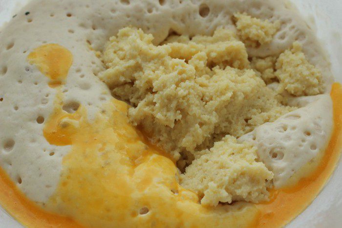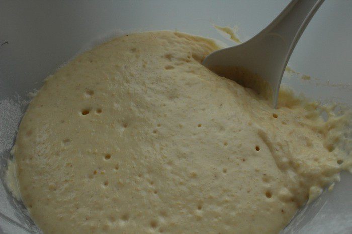 Соединить опару, пшено и яйца с маслом. Перемешать и дать повторно подойти в теплом месте 40-60 минут.