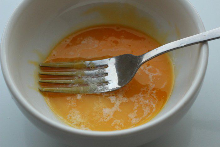 Яйца разделить на желтки и белки. Желтки перемешать, добавить растопленное сливочное масло.