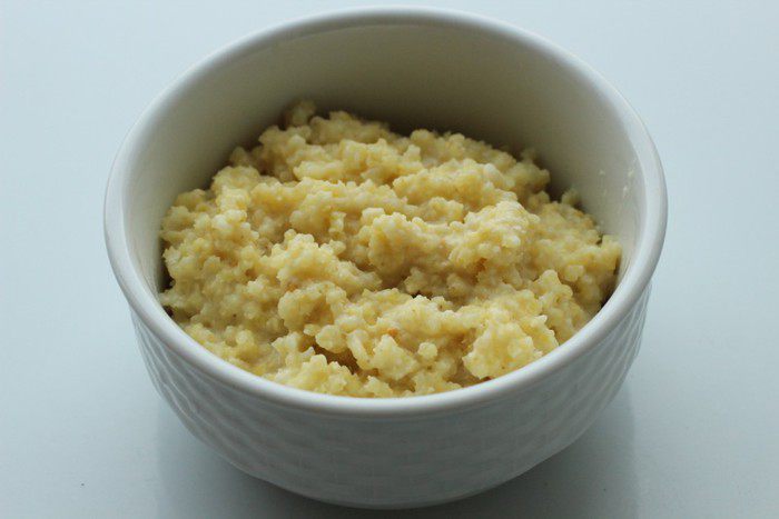 Пшено промыть, положить в кастрюлю, залить 1 л подсоленной воды и довести до кипения. Воду слить, залить пшено молоком, добавить соль, сахар и сварить до готовности. Готовую кашу остудить и протереть через сито.