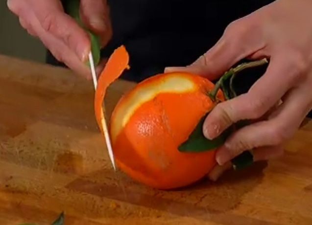 Цедру второго апельсина срезать ножом тонкими полосками.