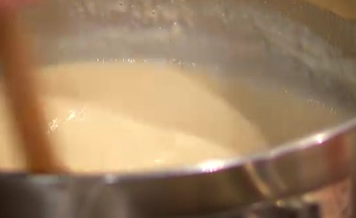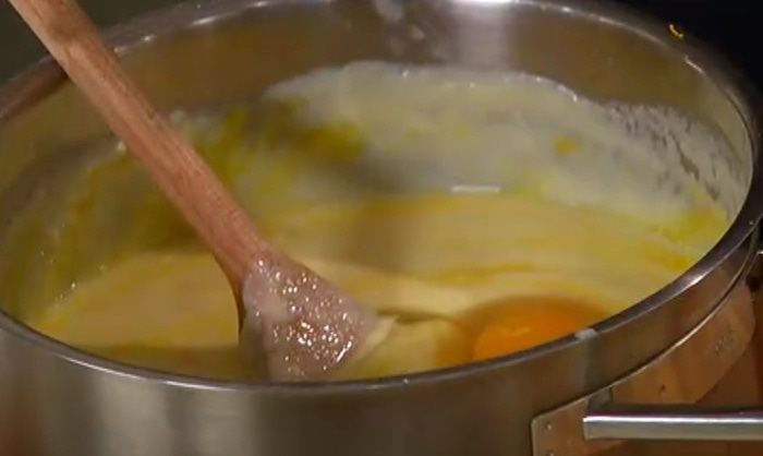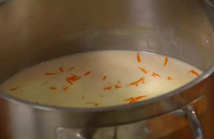 В большой кастрюле соединить молоко, ванильный экстракт, 150 г сахара и цедру апельсина, довести все до кипения.