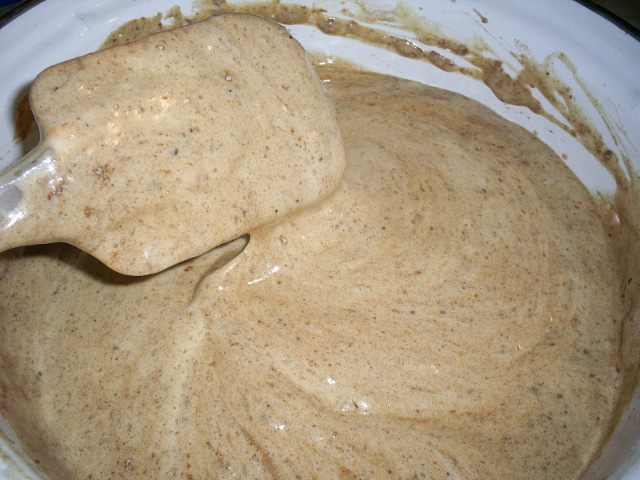 Кофе мы заранее растворили. Добавляем кофе в тесто, аккуратно перемешиваем. Готовое тесто стекает с лопатки ленточкой.