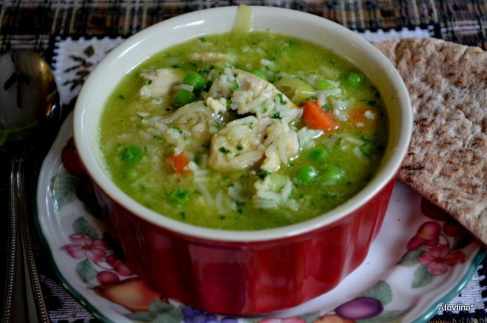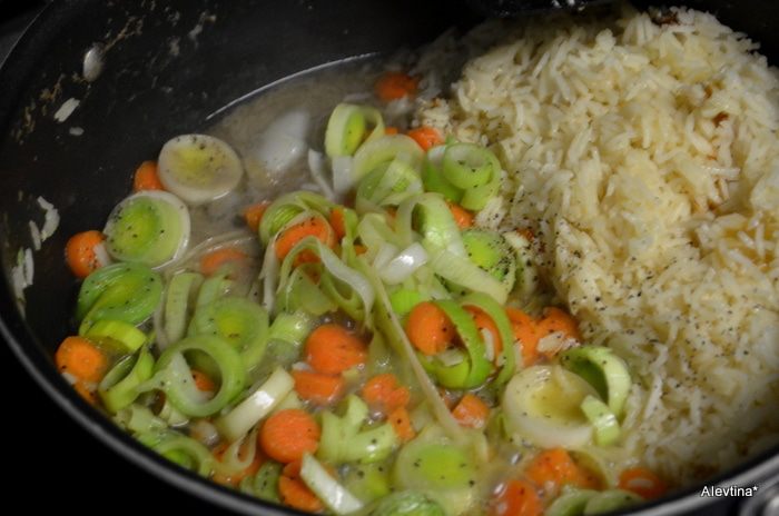 Добавить к готовому рису 2 ч.л оливковое масло, порезанный лук порей и морковь колечками. Соль и перец по вкусу. И тушим примерно 7 мин.помешиваем. Если у вас свежий горошек добавим к массе, если замороженный добавим в суп перед подачей на стол.