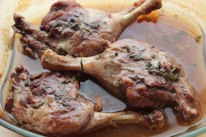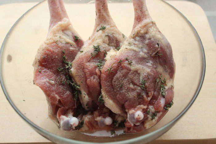 Натереть солью и перцем, посыпать листками тимьяна, затянуть пленкой и убрать в холодильник до тех пор, пока не остынет глинтвейн.