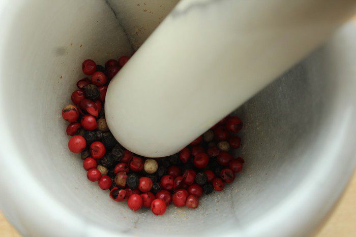 Смесь перцев измельчить в ступке в крупную крошку.