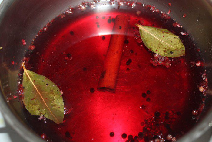 Сварить глинтвейн. Налить в кастрюлю вино, добавить перец, палочку корицы и лавровый лист, всыпать соль и сахар. Нагреть до 75-80 градусов. Убрать с огня и дать остыть до комнатной температуры.
