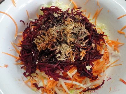 4. В одну глубокую посуду выложить вместе капусту, морковь (вместе с выделившимся соком) и свеклу, предварительно отжатую от сока. Сверху выложить мелко нарубленный чеснок, специи, соус и уксус. Не перемешивать