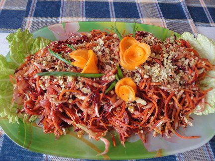 5. В сковороде разогреть растительное масло и прожарить нарезанный полукольцами лук до золотистого цвета. И сразу же вылить на овощи с пряностями. Добавить рубленые орехи и перемешать. Накрыть крышкой. Дать настояться как минимум 1 час.