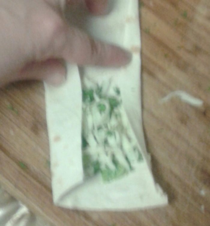 Лаваш нарезать полосками приблизительно 10х25 см. Завернуть в него смесь сыра и зелени.