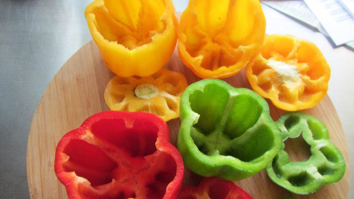 У перцев (у меня было 3 больших) аккуратно срезаем шапочки (они нам еще пригодятся). Вырезаем середину с семенами.