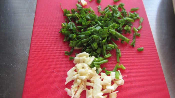 Также поступаем с чесноком и шнитт-луком (я чеснока взяла 1 зубчик, а Вы ориентируйтесь на свой вкус).