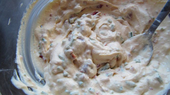 Смешиваем вяленые томаты, чеснок, лук с рикоттой, желтками и крахмалом. Все хорошо перемешиваем, солим, перчим по вкусу.