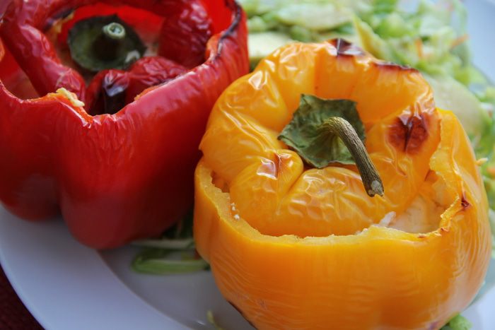Наполняем перцы нашей начинкой и сверху закрываем шапочкой. Выкладываем их в форму, наливаем на дно немного горячей воды и отправляем в духовку минут на 40.