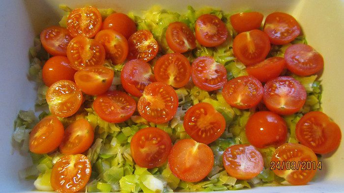 В форму для запекания выкладываем лук и помидорчики. Поливаем половиной соуса.