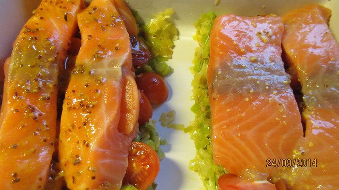 Сверху выкладываем рыбное филе и поливаем оставшимся соусом. Отправляем в духовку 180-200 гр минут на 20, до готовности рыбы.