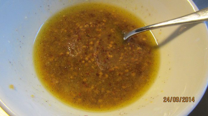 Для соуса смешиваем оливковое масло, горчицу, мед, лимонный сок, соль и перец.